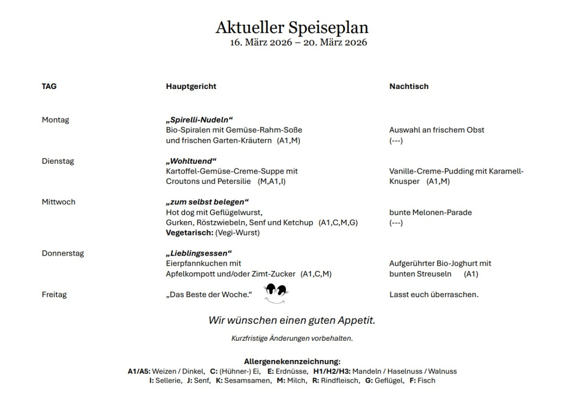 In unser neuen großzügigen Mensa sorgt unser Koch Herr Penz mit seinem Küchenteam dafür, dass sich die Kinder rundherum wohlfühlen. Es wird in einer sogenannten "Mischküche" frisch und gesund gekocht. natürlich wird auf Regionalität und auch auf die Lebensmittelqualität geachtet. 100% Bio schaffen wir nicht, aber unser Augenmerk liegt auf Ausgewogenheit, Frische und Nachhaltigkeit. Ein jedes Mittagessen besteht aus Salat/Rohkost, Hauptgericht und Nachtisch. Besondere Ernährungsnotwendigkeiten (Unverträglichkeiten, religiöse/ethische Gründe) sind individuell und nach Absprache umsetzbar. Bitte setzen Sie sich mit dem OGS-Büro in Verbindung, falls Ihr Kind vegetarisch isst, besondere Fleischsorten meidet oder eine Unverträglichkeit hat.